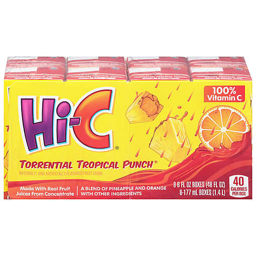 Treat your kids to fun fruitiness with Hi-C Torrential Tropical Punch Juice Boxes. A delicious blend of pineapple and orange that will quench their thirst with on-the-go convenience. Made with real fruit juice from concentrate, these juice boxes for kids contain 100% Vitamin C and 40 calories per box. Ideal for lunch boxes, after school, hanging with their friends, or anytime they need flavor-filled drinks that you'll feel good about giving them. Stock up on all the flavors they love, all with a full day's supply of vitamin C.